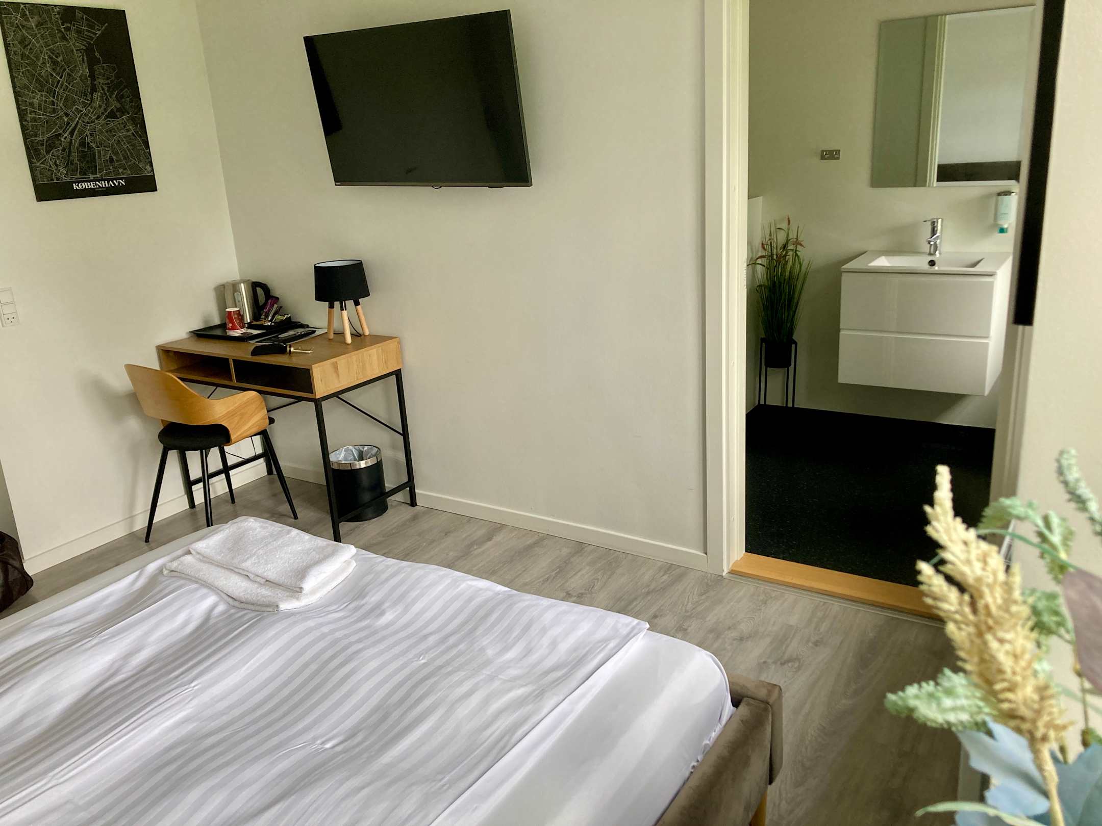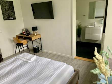 Zimmer mit Stuhl, Tisch und Fernseher. Blick ins Bad.