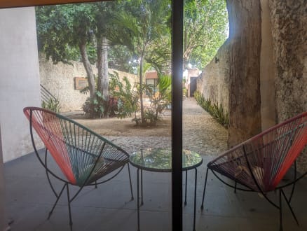 GartenanlageBlick aus dem Doppelzimmer auf den Innenhof. Der Pool liegt leicht versteckt hinter den Bäumen.