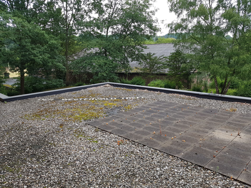 Blick vom Balkon auf Dach und Parkplatz