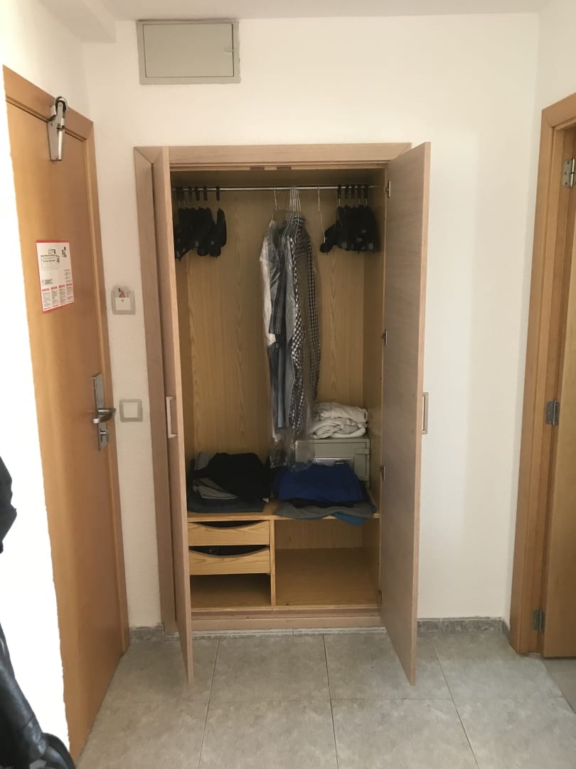 Geräumiger Kleiderschrank mit ausreichend Bügeln und Safe.