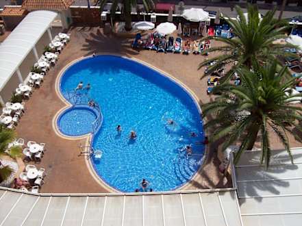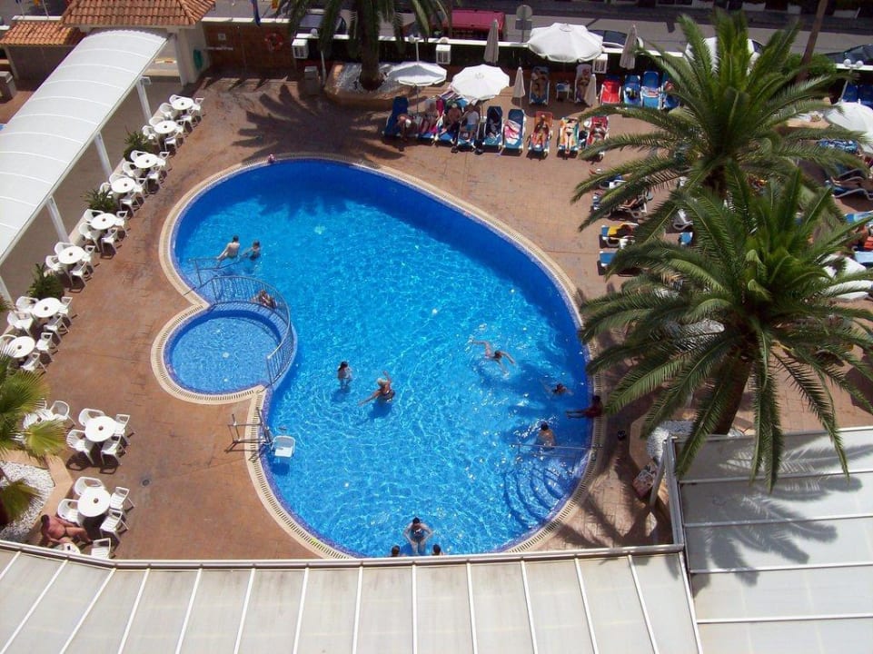 Poolanlage vom Balkon ausSo sah die Poolanlage vom Balkon aus, es wird grade von Liegestühlen zu Tischen und Bestuhlung für den Abend umgebaut.