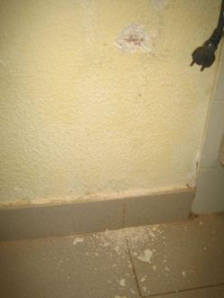 Das Grundwasser hat die Wände derart aufgeweicht, dass der Putz von der Wand bröckelt. Entsprechend stinkt es im ganzen Haus!