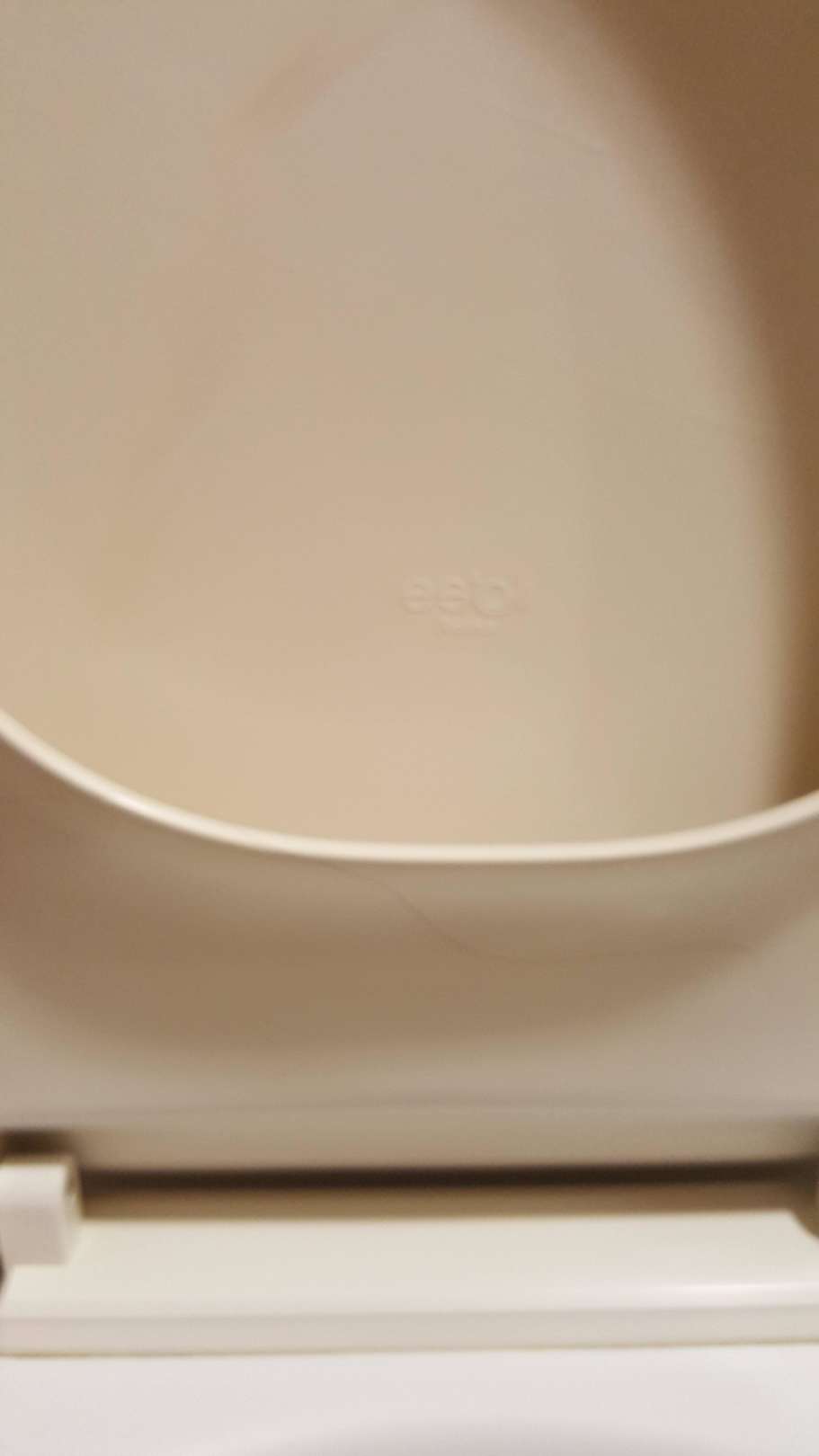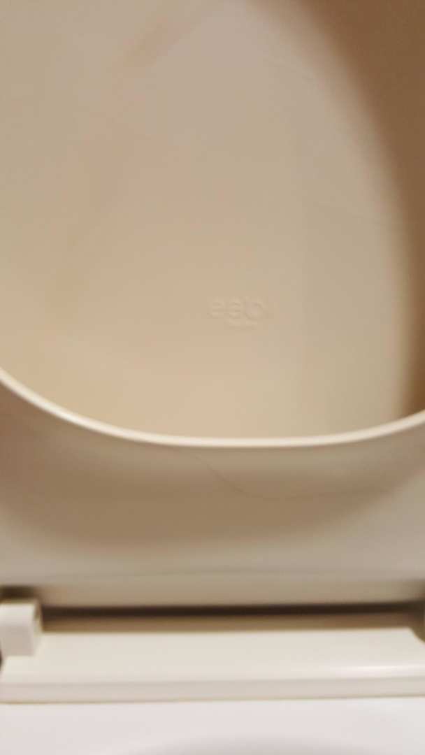BadezimmerchenToilettendeckel, der mit einer Bandarole "Frisch desinfektiert" versehen war. Man beachte die Haare.