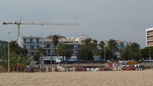 Blick von Strand auf das Hotel H Top Planamar, der Kran im Hintergrund gehört zu einem anderen Hotel.