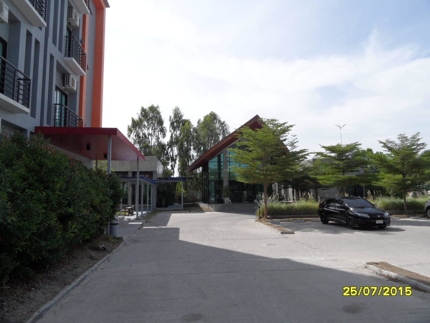 Blick auf Parkplatz und Rezeption