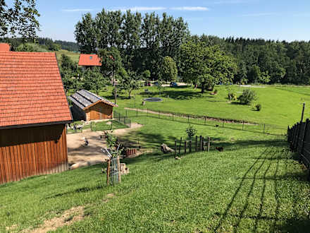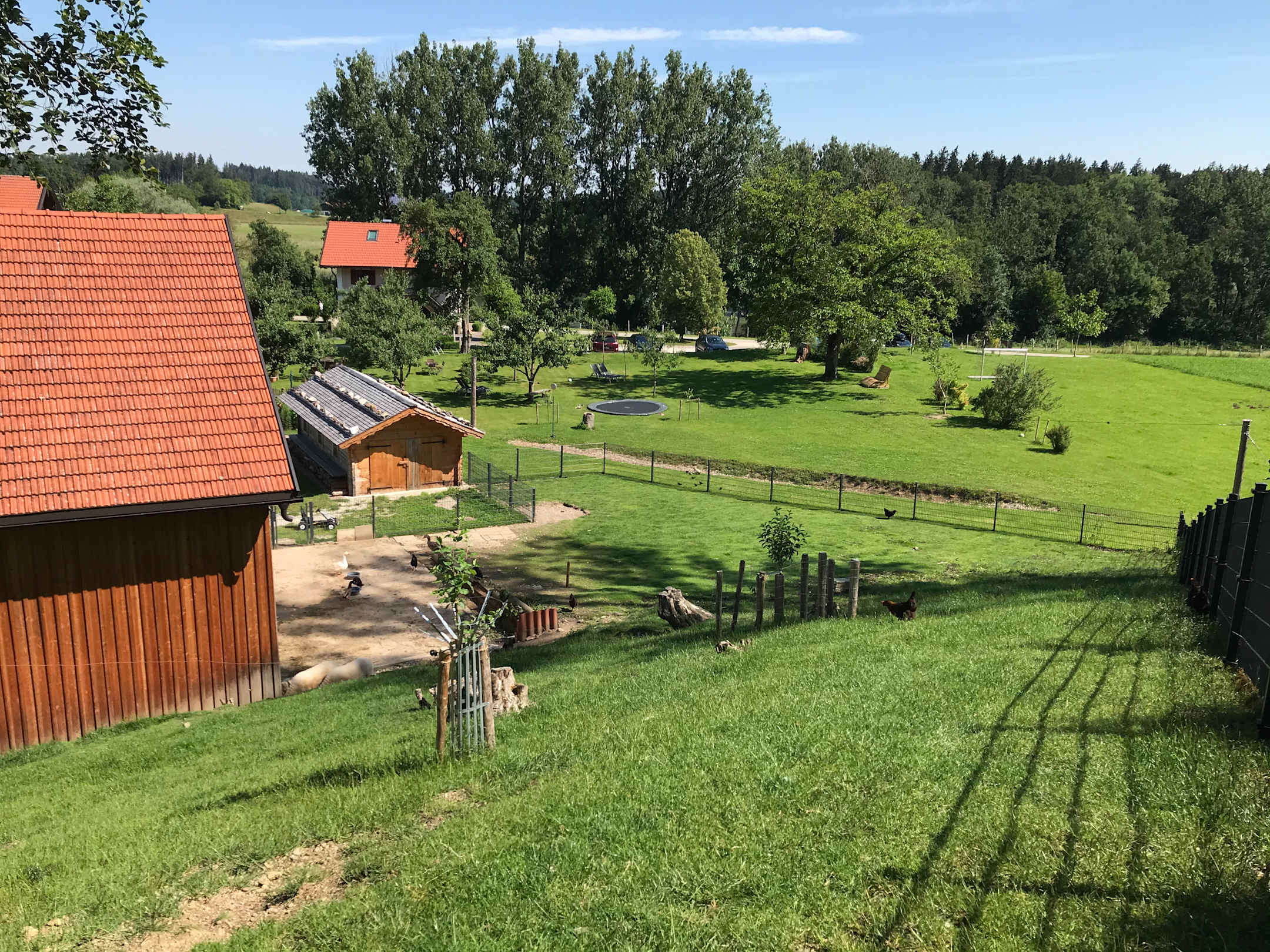 Freigehege und Teil des Spielplatzes mit Seilbahn und Trampolin
