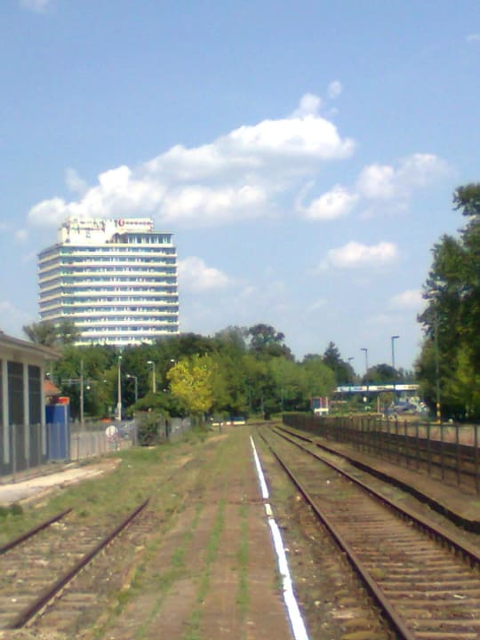 Blick vom Bahnhof aufs Hotel (rechts die Brücke)