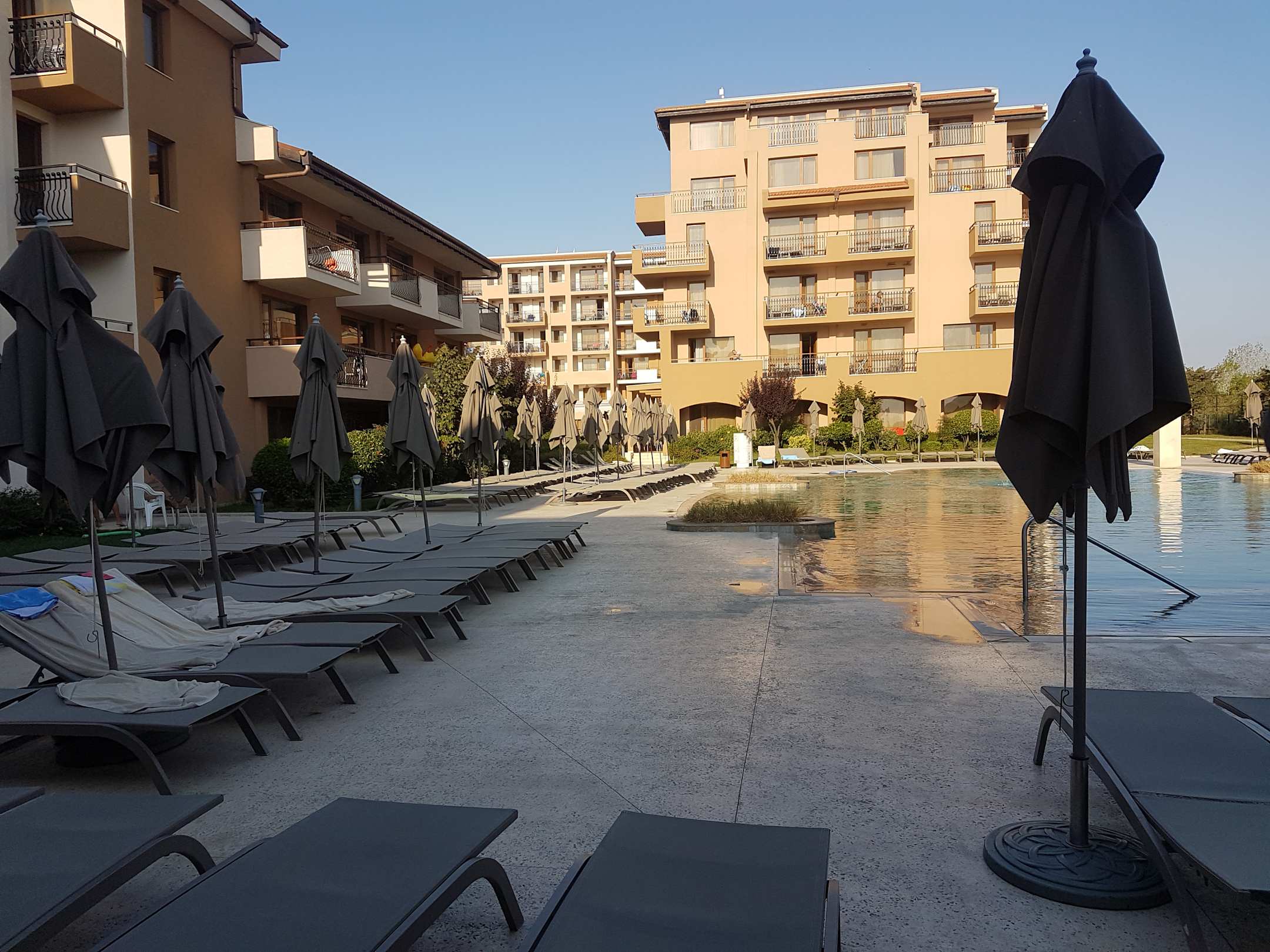 Poolgegen 08.45 Uhr. Viele Liegen noch frei aber relativ eng. Eigentlich sind immer Liegen frei.