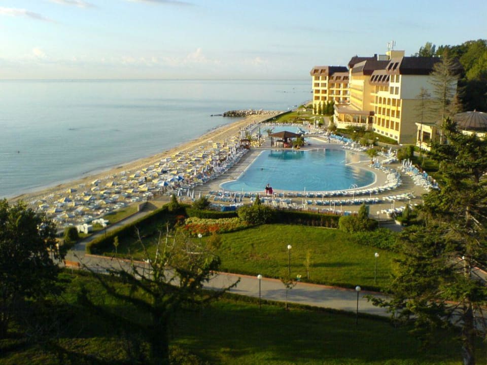 Blick vom ZimmerbalkonAusblick auf den Poolbereich, den Strand und aufs schwarze Meer. Aufgenommen im Hotel Riviera Beach am Goldstrand von Bulgarien.
