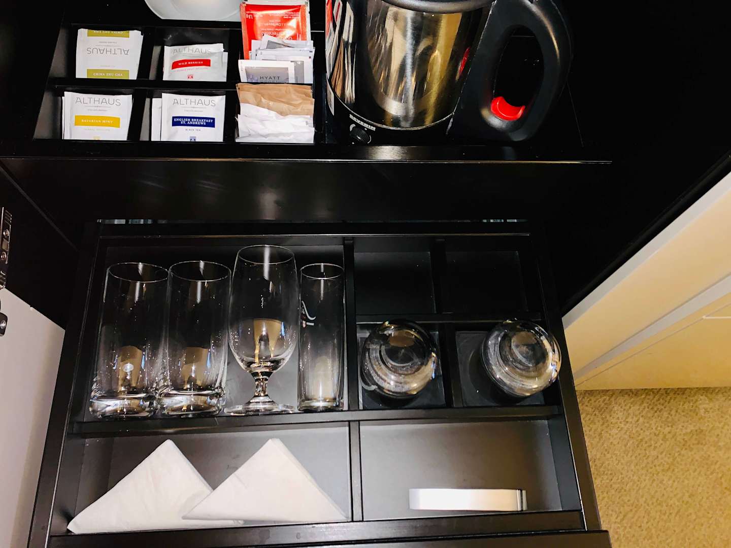 Minibar mit den schmutzigen Gläsern