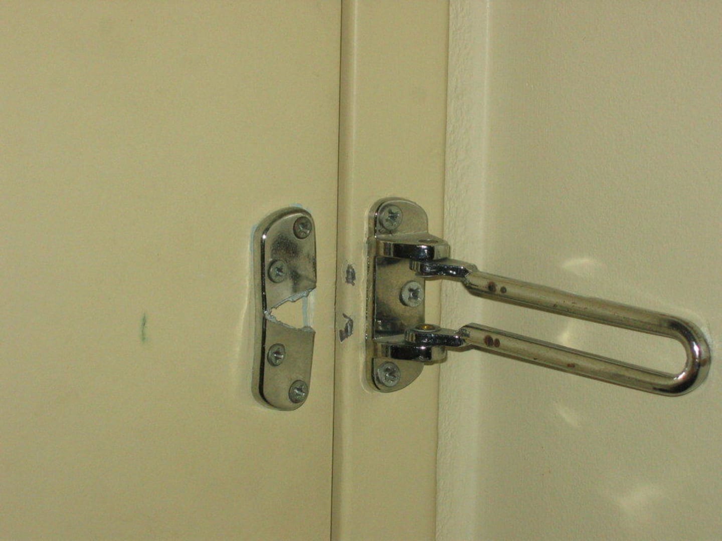 Der Sicherheitsriegel wurde bei einem gewaltsamen Eindringen einfach abgebrochen; dies steigert nicht unbedingt das Sicherheitsgefühl bei den Gästen ...