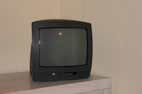 TV-GerätDie Blende vom TV-Gerät fehlt. Platinen sichtbar, benutzung nicht möglich. Hotel Eurocalas. Zimmer im Haus Cabrera. Juli 2012
