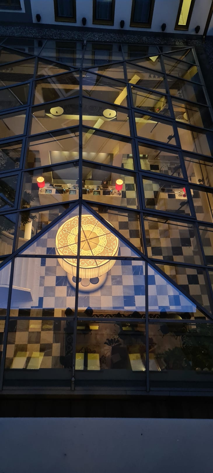 Ausblick vom Hotelflur auf das Glasdach der großen Lobby