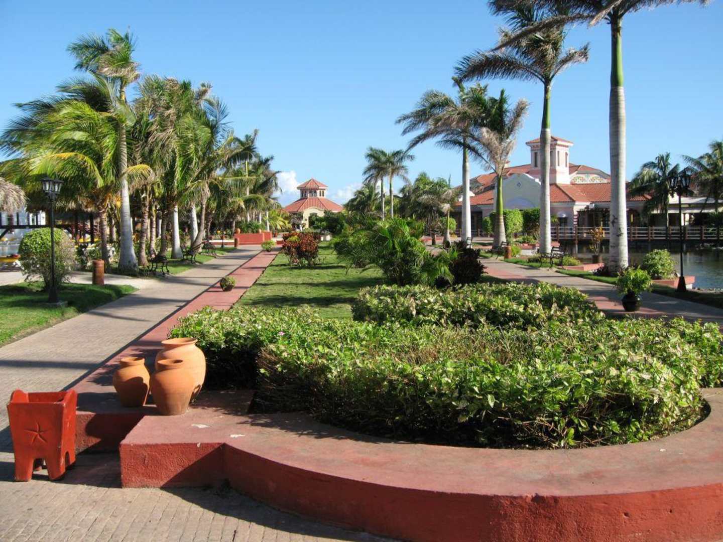 Hier ist der Beweis, dass es eine liebevoll gepflegte Hotelanlage mit Grünanlage und Liebe zum Detail (Tontöpfe) ist. Der Blick ist vom Hauptrestaurant Richtung Bucanero Grill/Strand.