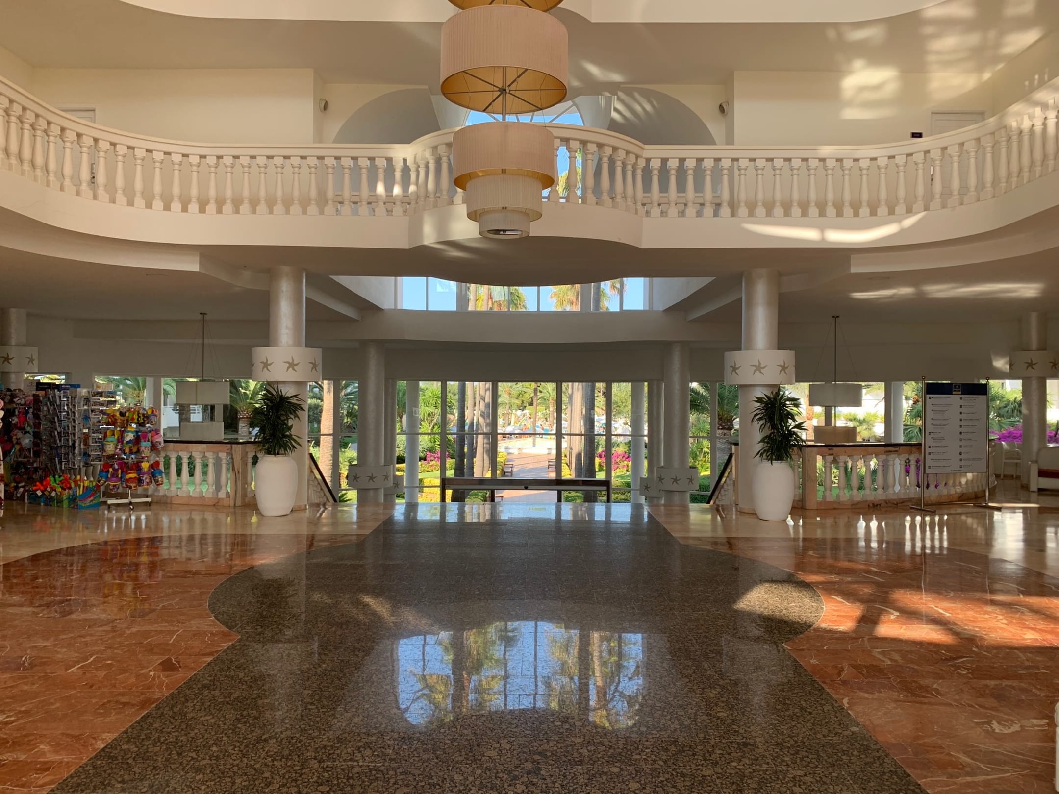 Lobby Albufera Park mit Blick auf Gartenanlage Richtung Strand. Kleiner Shop links.