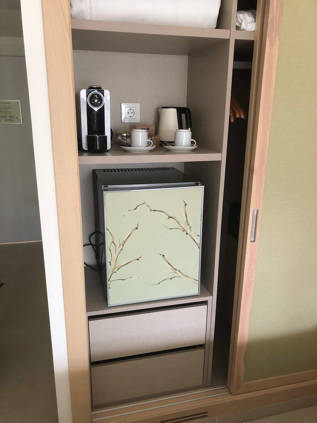 ZimmerMinibar ( leider ohne Kühlung, Kapselmaschine mit 2 Tassen und Kaffeekapsel, 2 Schubladen unter der Minibar