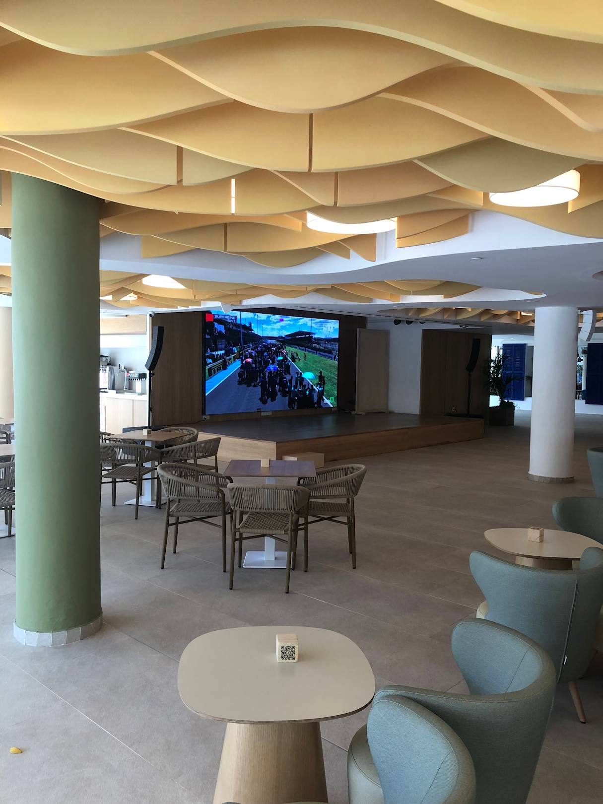 Große Poolbar mit großer Leinwand und kleinere Fernseher an den Säulen.