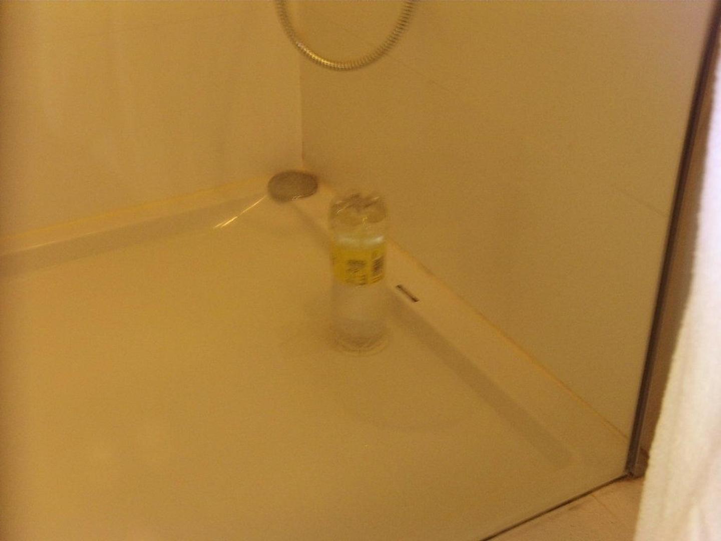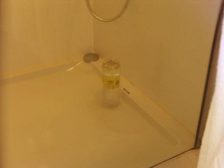 Mit Wasser gefüllte Schweppesfla- sche. Der Flaschenhals wurde mit Papier umwickelt, die Dusche bis zum Rand mit Wasser aufgefüllt. Und das in einem 4 Sternehotel!