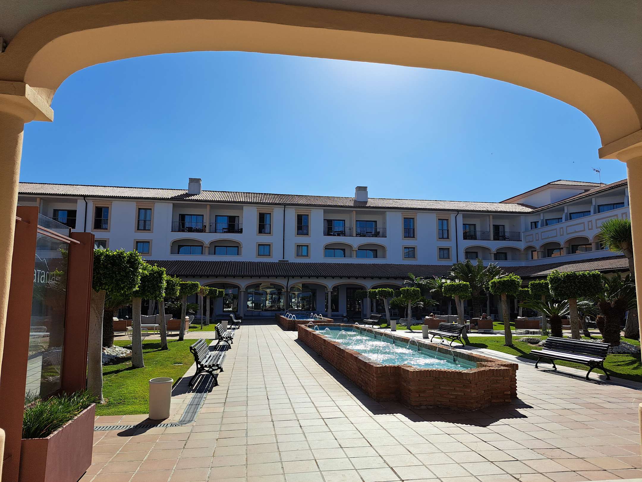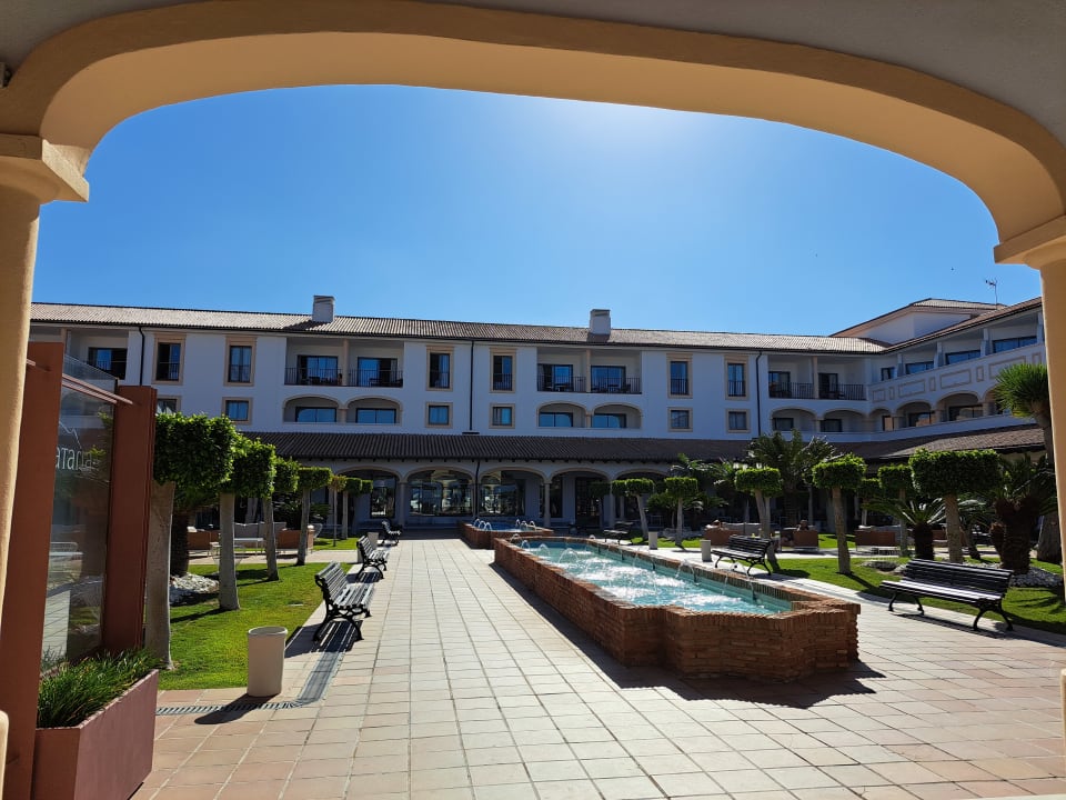 AußenansichtBlick auf den Hotelteil mit Rezeption und Lobby, am Ende der Brunnen vor den Fenstern fanden die Liveauftritte statt