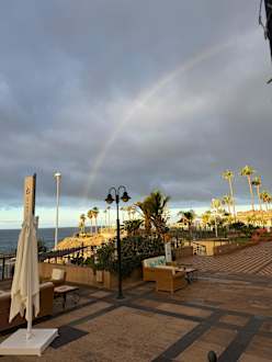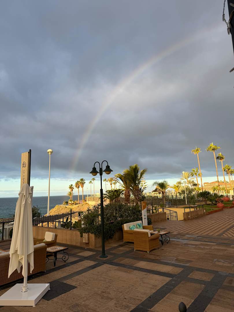 AusblickSonnenaufgang mit Blick auf La Gomera vom Garten aus. Unterhalb der Anlage verläuft die Strandpromenade.