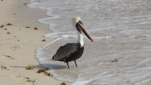 Einer der vielen Pelikane am Strand