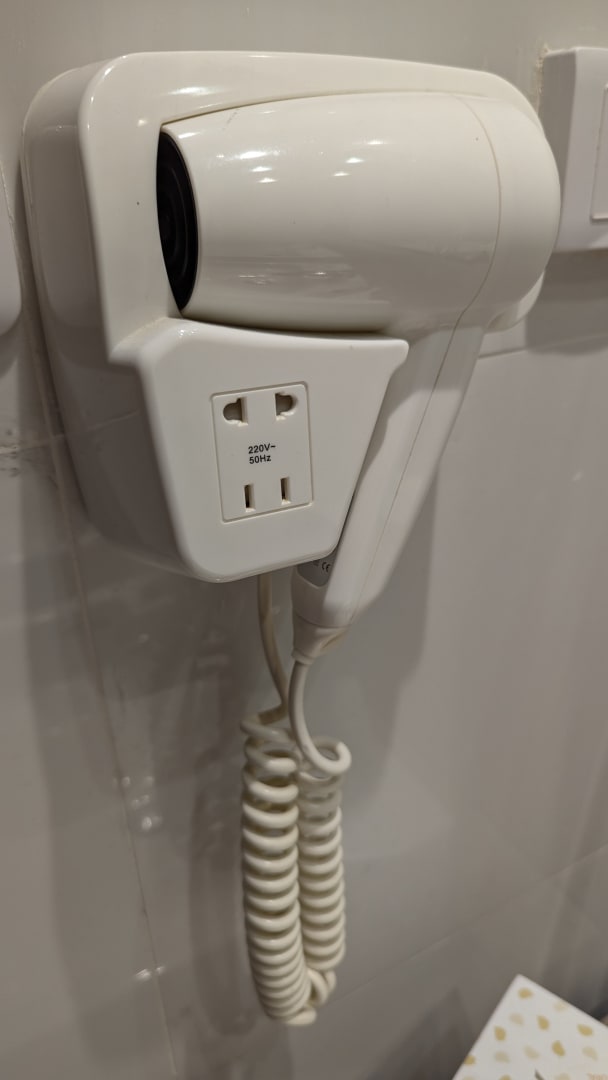 Föhn im Bad des Zimmers. Mit der einzigen Steckdose ohne den in Tunesien üblichen Mittelstift.