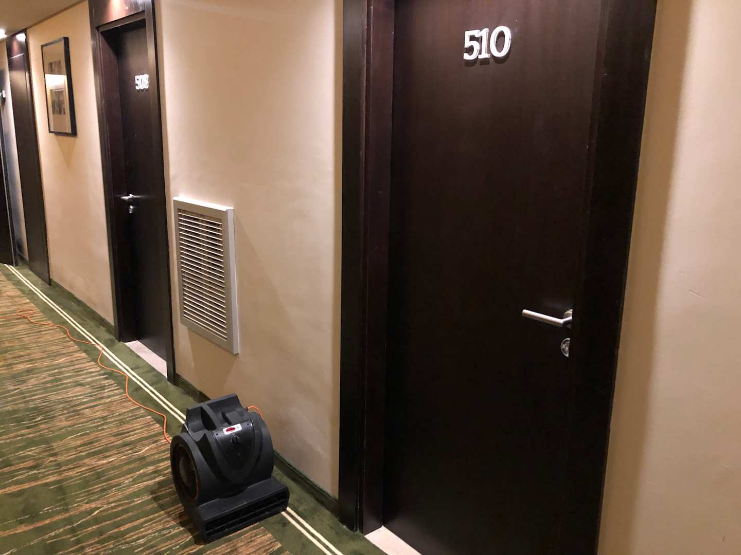 Bautrockner nach Wasserrohrbruch verursacht durch Bauarbeiter vor Zimmertür.
