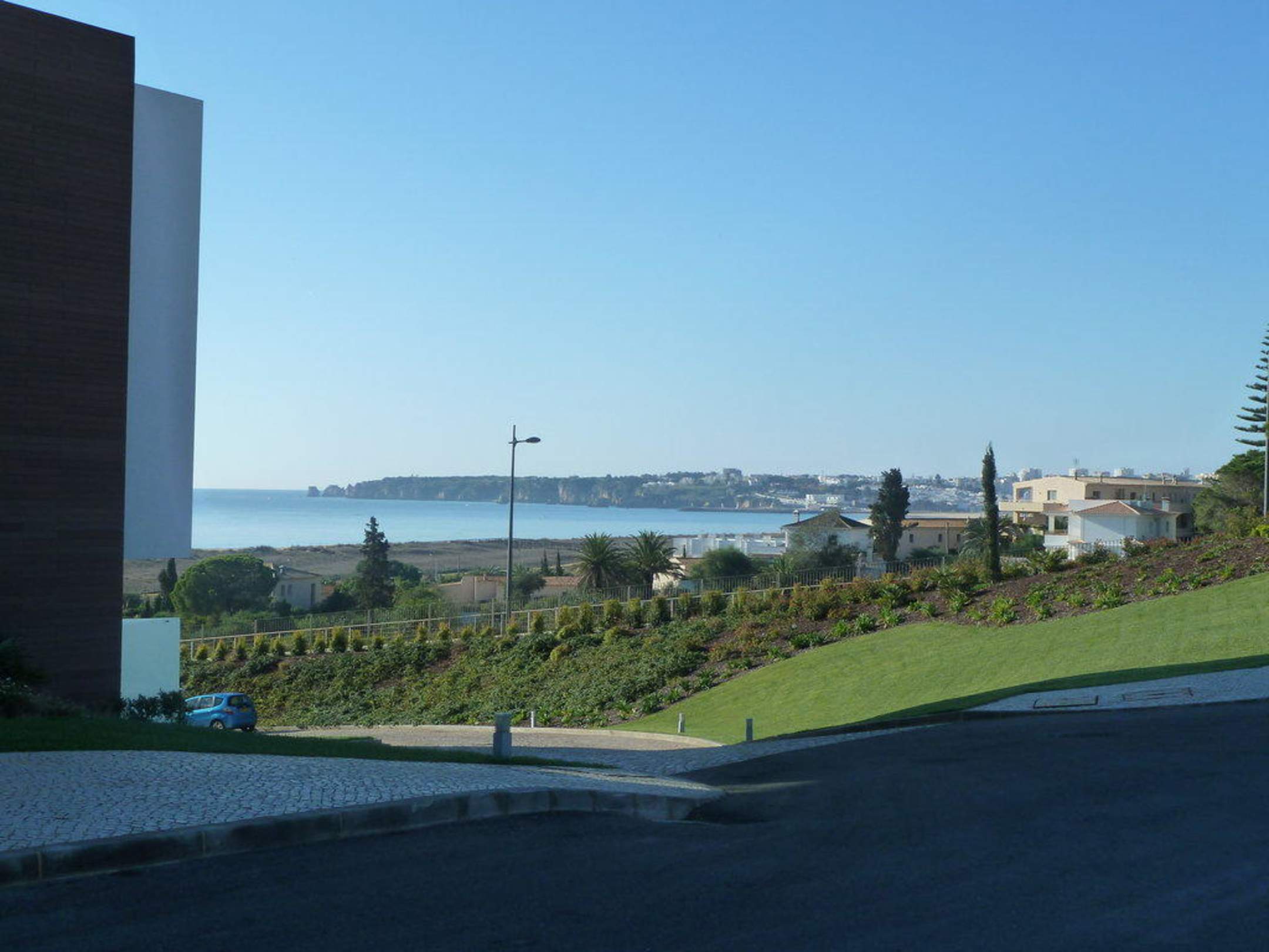 Vor dem Haupteingang aufgenommenseitlicher Blick Richtung Strand