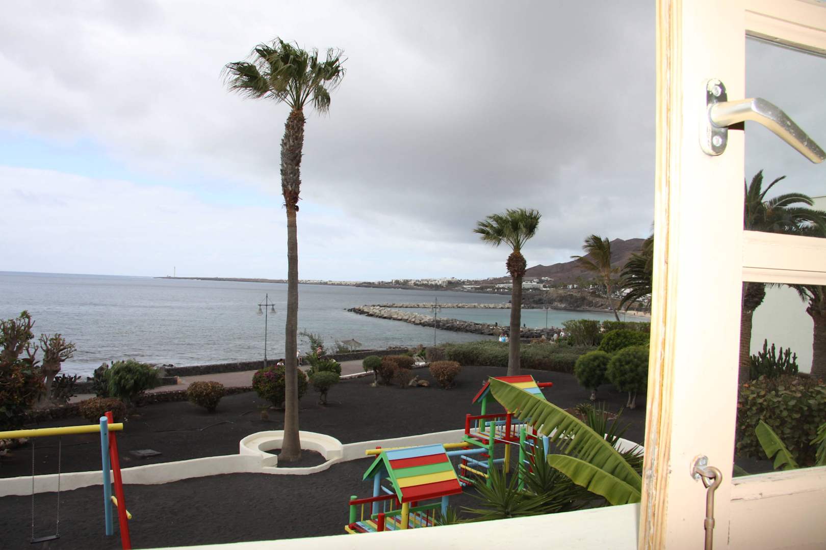 ... aus dem SchlafzimmerSeitlicher Blick aus dem Schlafzimmer Richtung Badebucht und "Punta de Pechiguera". Im Vordergrund der Kinderspielplatz.