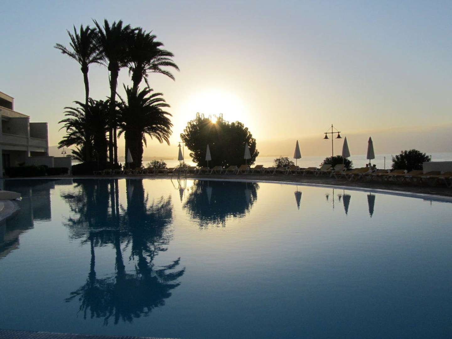 Sonnenaufgang Morgens um 8 Uhr ging die Sonne über dem Meer auf und spiegelte sich im Pool. Alles war noch ruhig, die Luft noch frisch.
