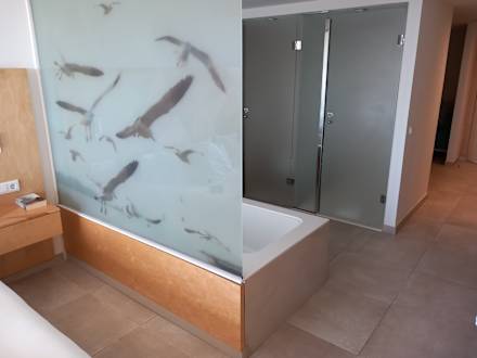 links Bett, dann erwähnte Glaswand, dann Toilette und Dusche