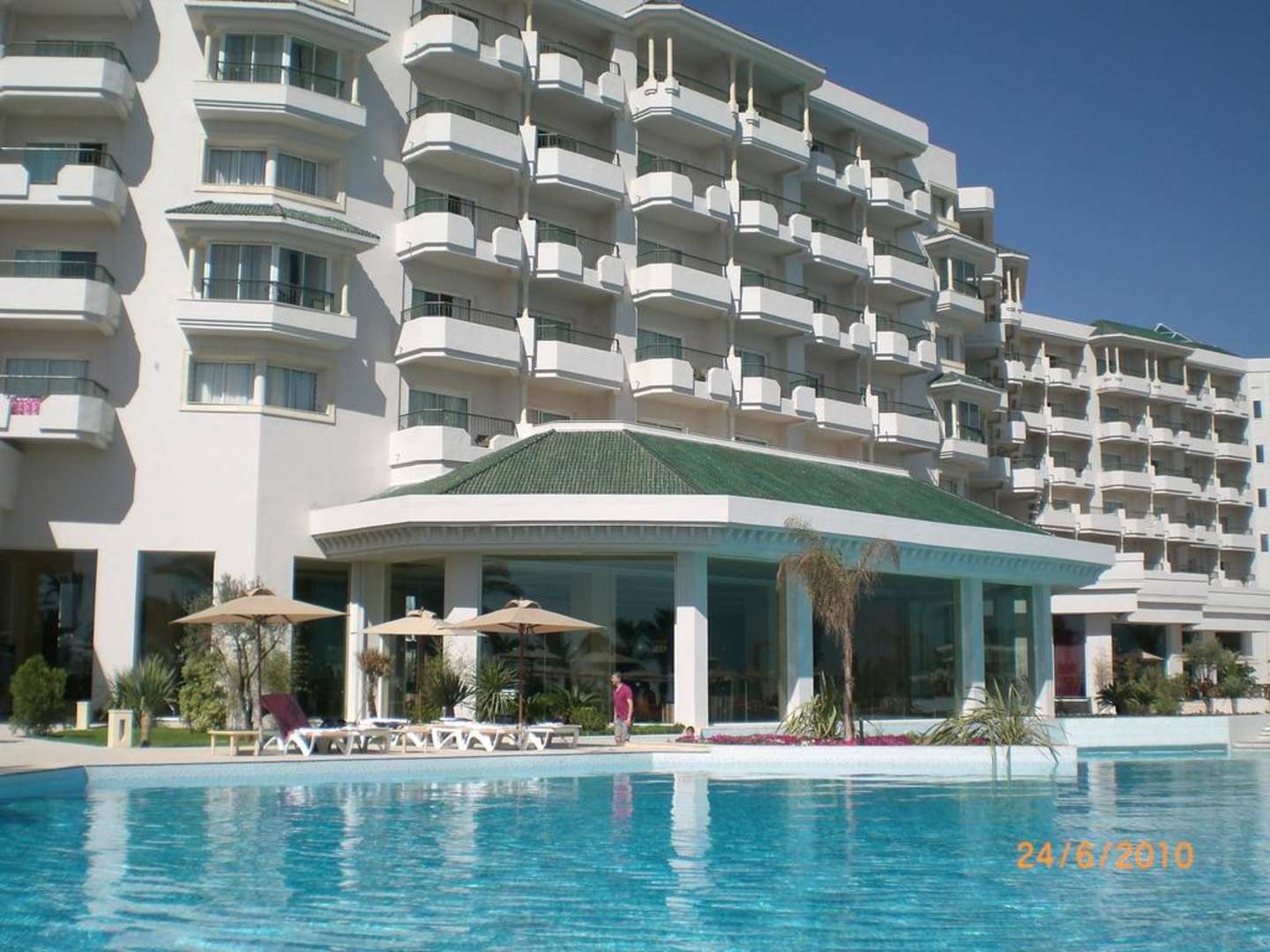 Blick von der Liege auf Pool und HotelIm Hotel befindet sich unten die Lobby mit Glasfront.