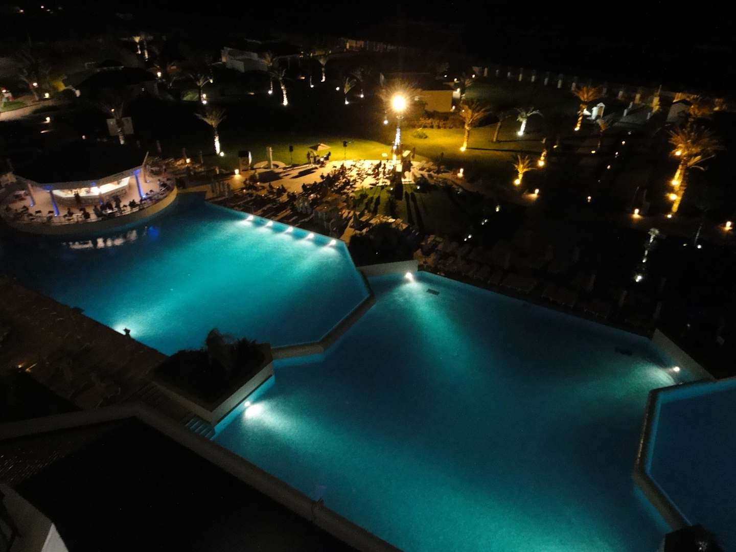 Teil der Poolanlage am AbendTeilbereich des Poolanlage mit Poolbar in abendlicher Stimmung und Musik