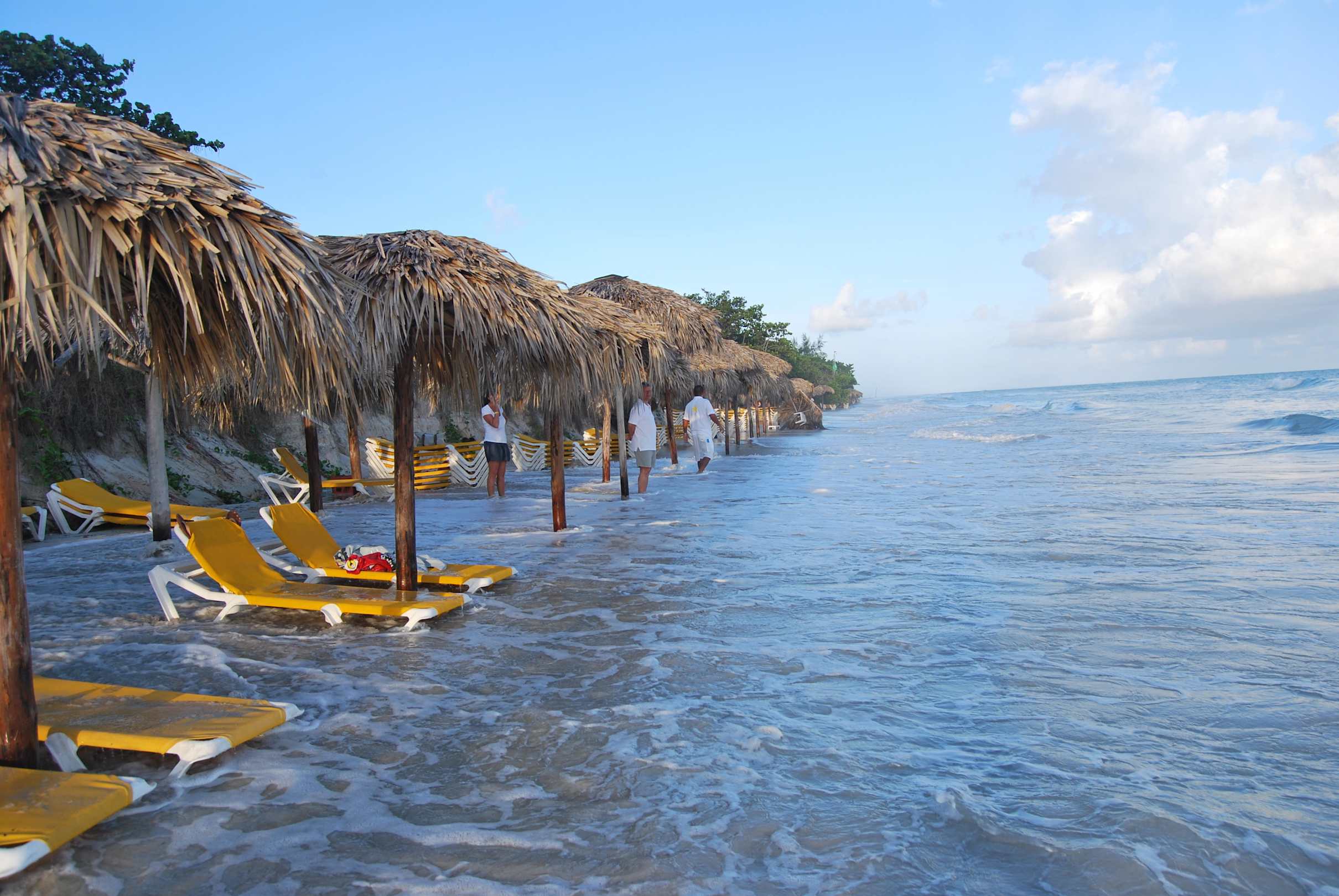 Bei höheren Wellen stehen Liegen im Wasser