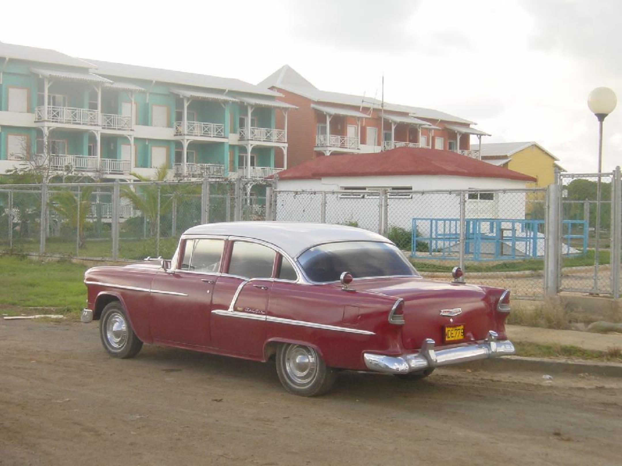 Angestelltenparkplatz des Hotels Iberostar Varadero mit typischem alten US-Strassenkreuzer und Blick auf das Nachbarhotel Sandals Royal Hicacos.