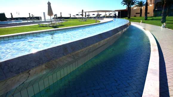 Umlaufende Wasserrinnen mit edler Marmorverkleidung säumen dUmlaufende Wasserrinnen mit edler Marmorverkleidung säumen den Pool