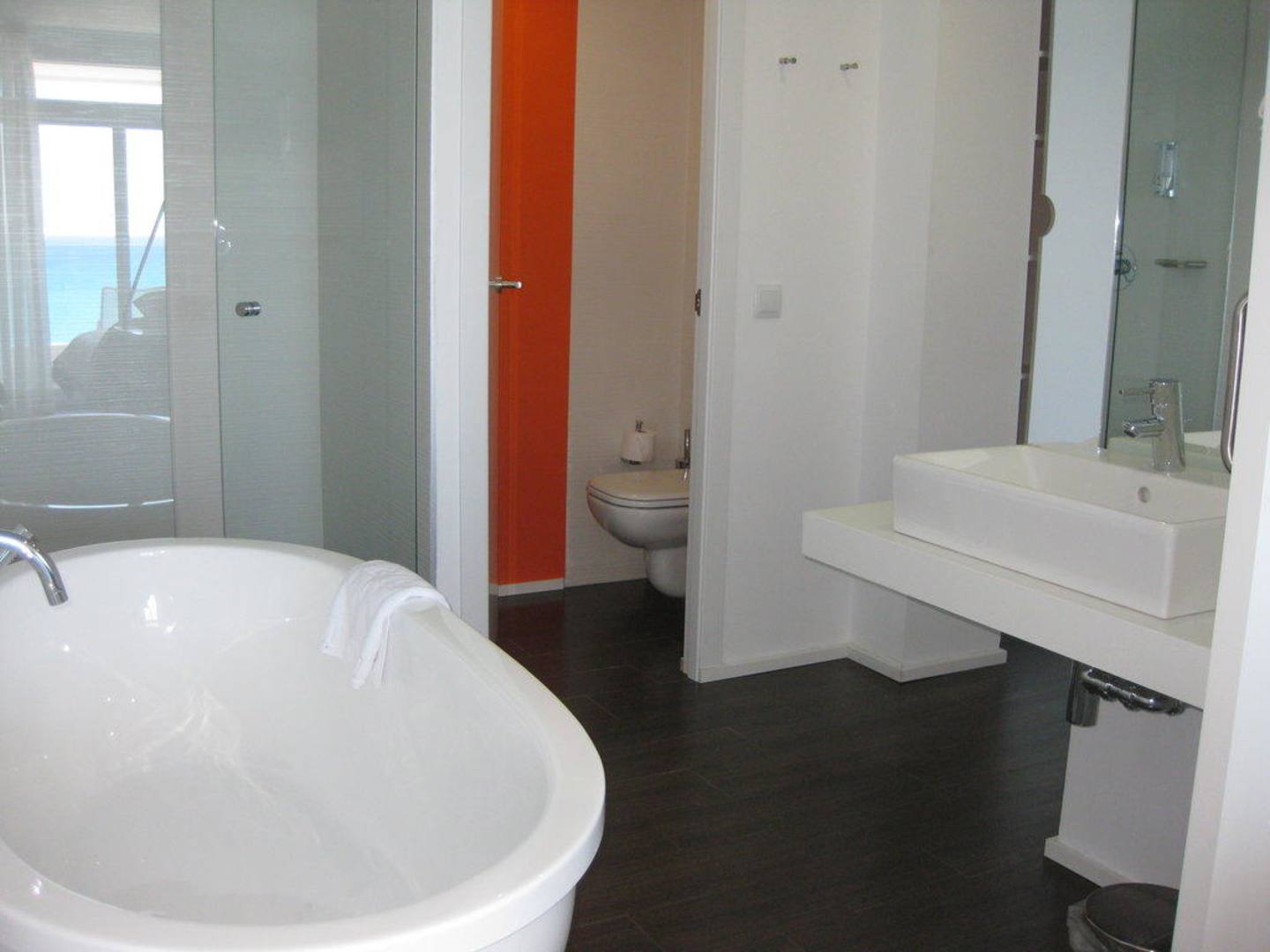 Bad und WCdie Juniorsuite hat Badewanne, Waschtisch, Dusche mit Glastür (links hinten) und eine Tür zum WC (etwas eng)