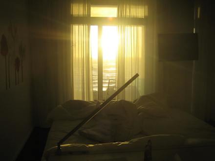 ZwielichtMorgendämmerung vom Bett aus auf das Meer