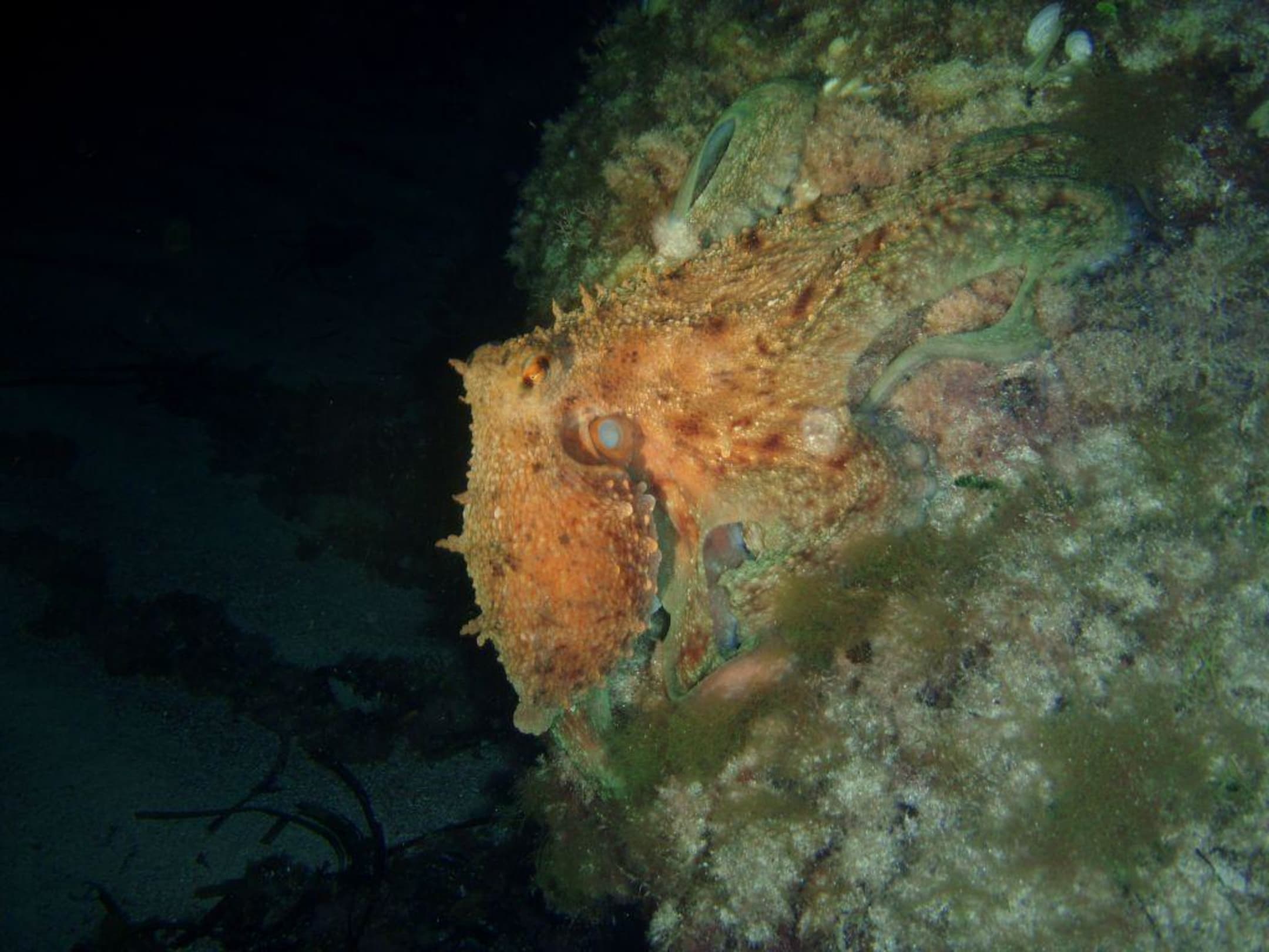 Nachts, unterwasser kann man sehr viele unterschiedliche Fische sehen-wie hier zum Beispiel ein Octopus in ca 2,50m Tiefe,nicht weit vom Strand weg.