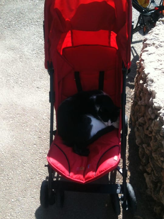 Die Katze machte es sich in dem Kinderwägen bequem