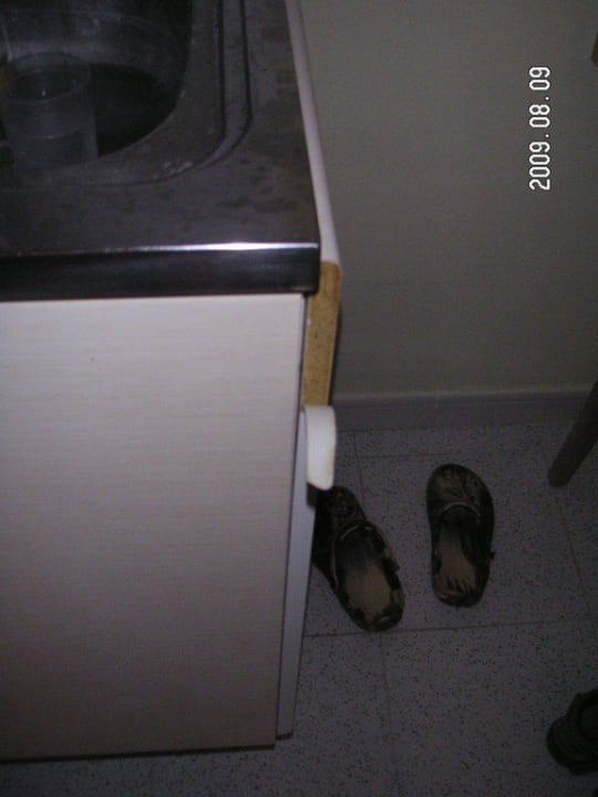 Küchenblock: Vorne löst sich die Leiste und hinten wird die Platte dick weil nichts abgedichtet ist! Ach ja, hing die ganze Woche so runter!