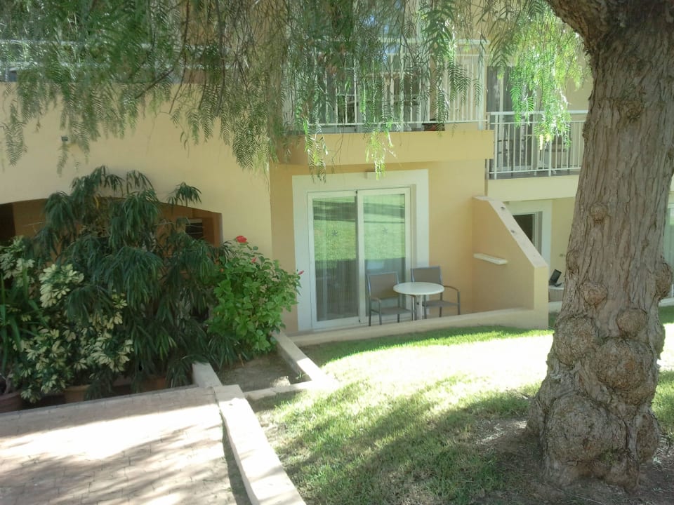 zu sehen ist meine Terrasse, nebenan hinter den Grünpflanzen sind die Waschmaschinen, Toiletten, Cola-Automat - laut und keine Privatsphäre. (Zimmerkategorie Familienzimmer)