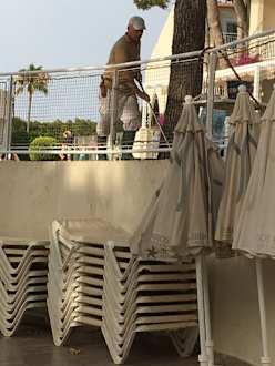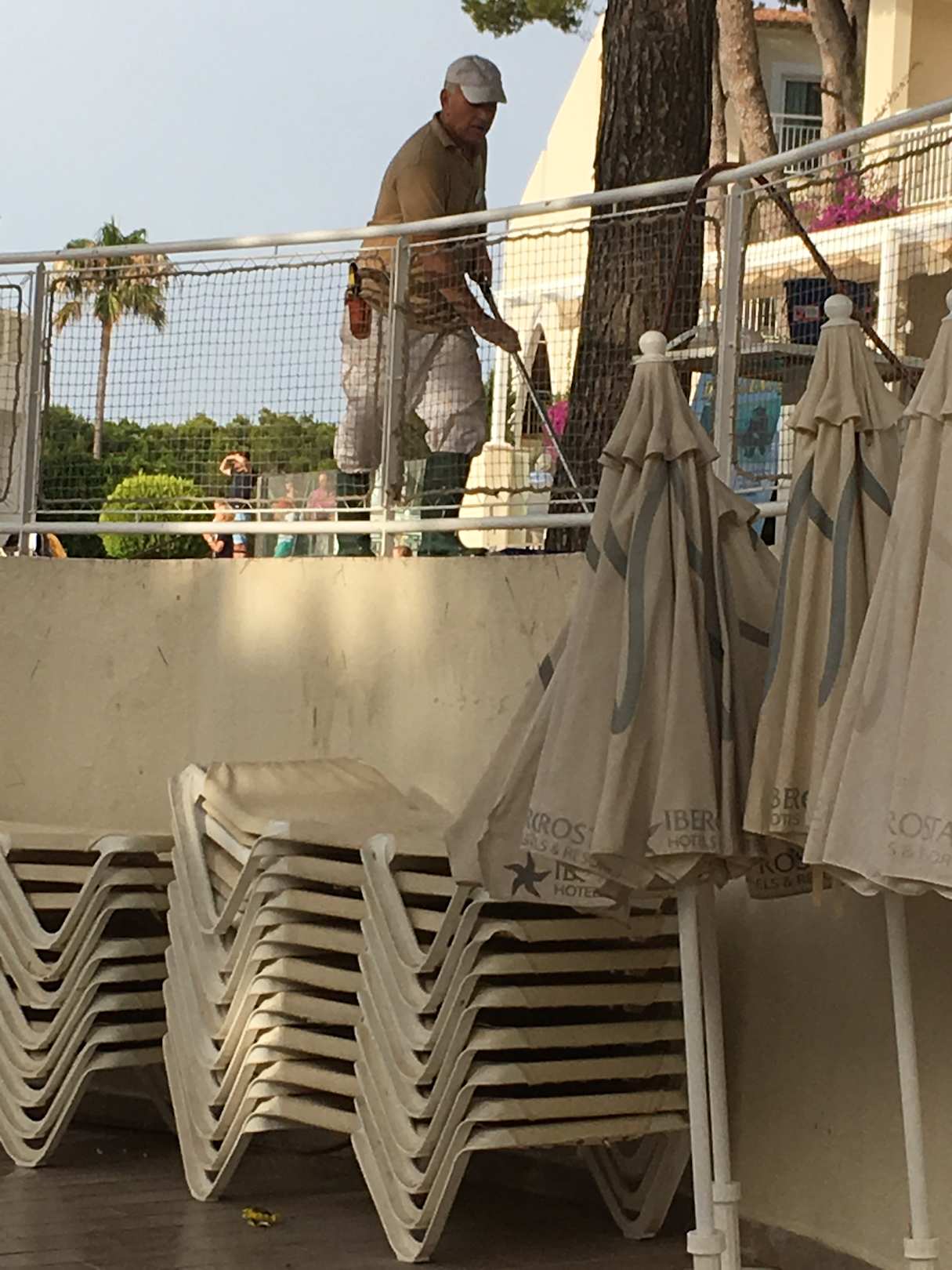 PoolReinigung der Poolanlage. Hier wird gerade das Schmutzwasser von der oberen Ebene auf die Untere Ebene über die gestapelten Liegen geschüttet...