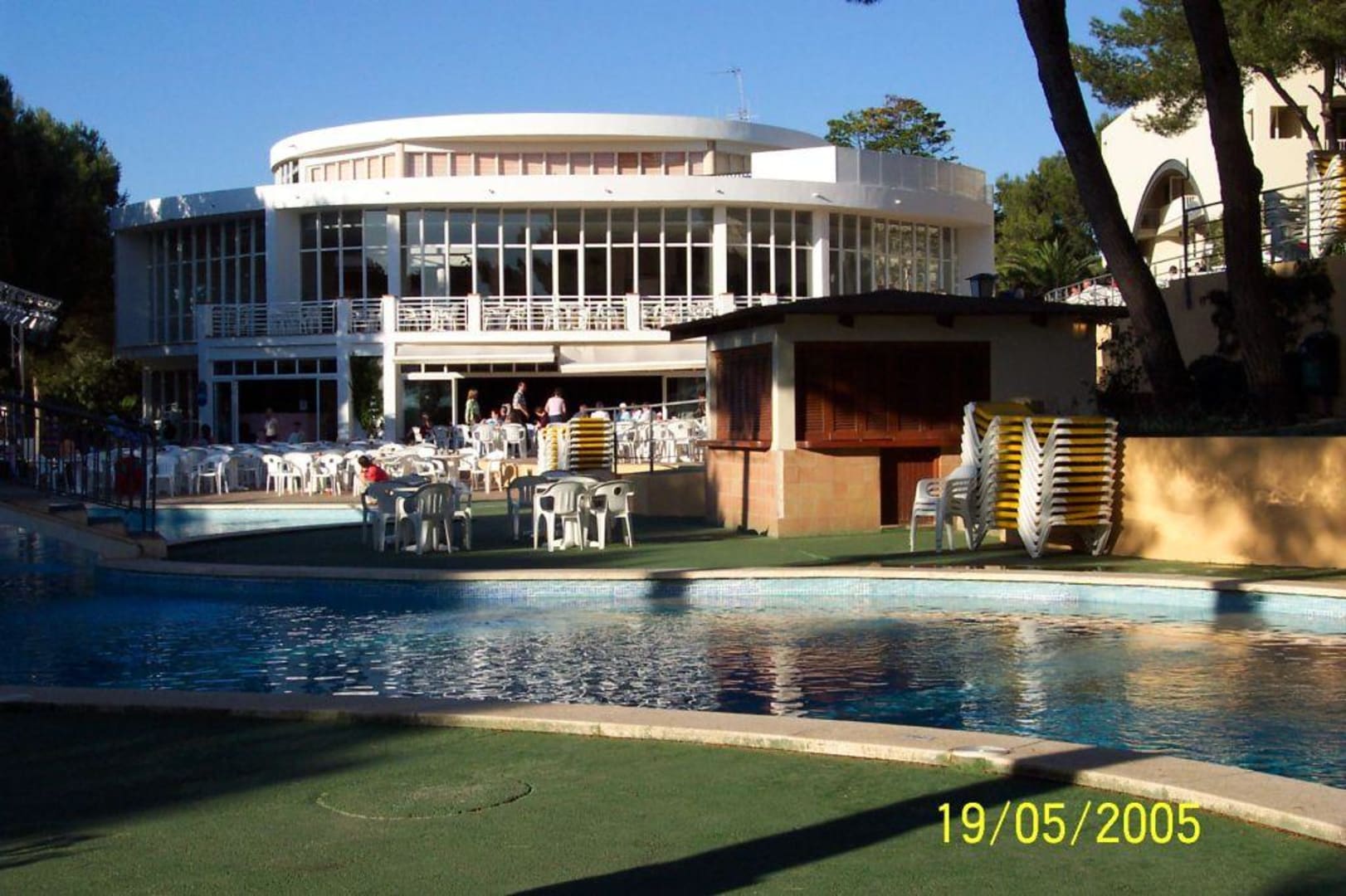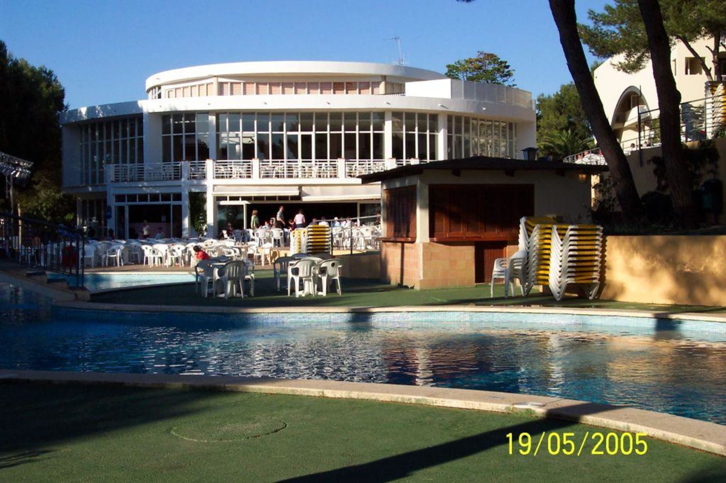 Das Rezeptionsgebäude (oben) und die Disco-Bar (unten) mit der Bestuhlung davor für die Abendveranstaltung, die meistens auf der Bühne im Freien stattfindet.