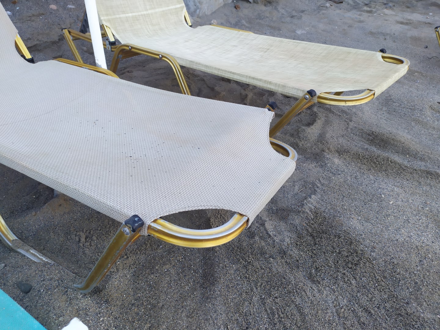 Strandgebrochene und defekte und schmutzige Strandliege.