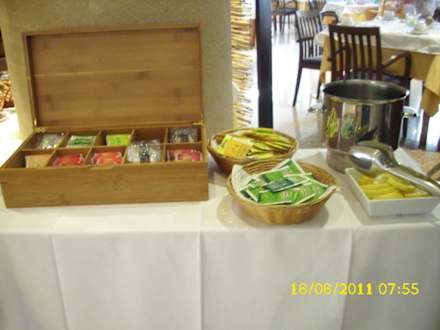 TeeangebotFür Teetrinker steht eine gute Auswahl an Teesorten zur Verfügung. Heißes Wasser und Zitrone gibt es natürlich auch.