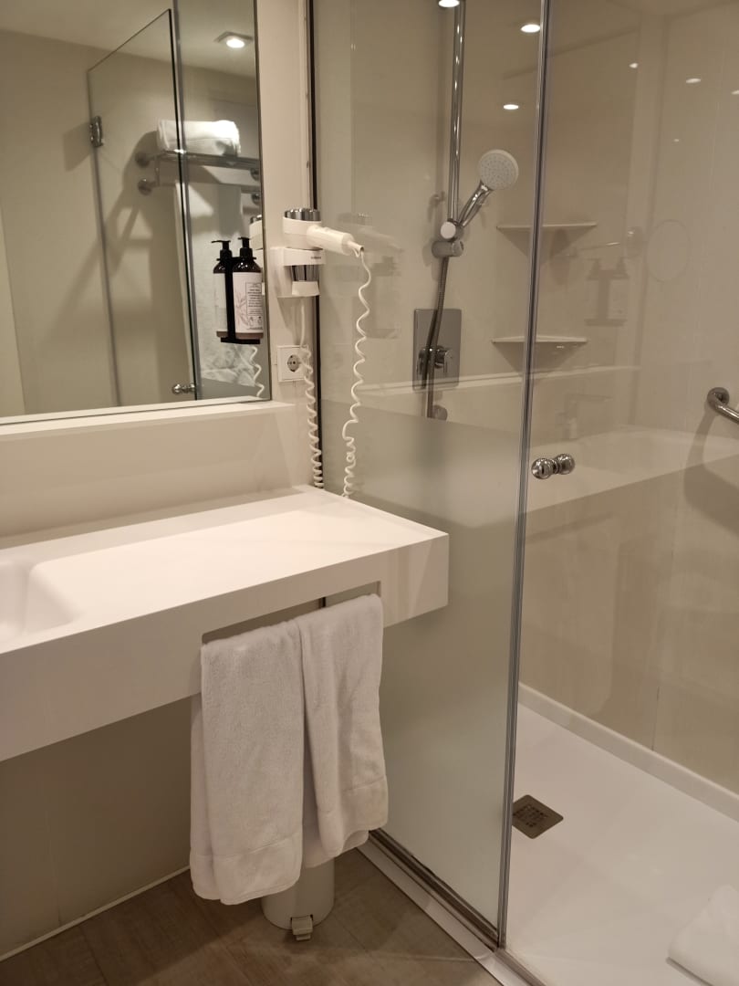 ZimmerEbenerdige Dusche und Waschtisch mit Abstellmöglichkeit