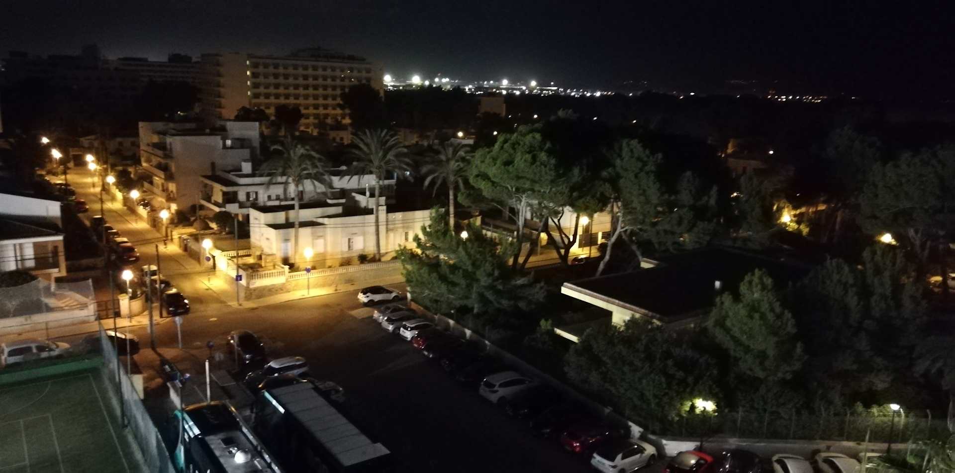 Ausblickvom Balkon zum Flughafen, hinten die Beleuchtung mit Tower, aber kein Lärm