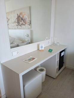 ZimmerSideboard mit Kühlschrank. Mit der Glaskaraffe kann 24/7 Wasser an den Automaten in Aufzugnähe geholt werden.