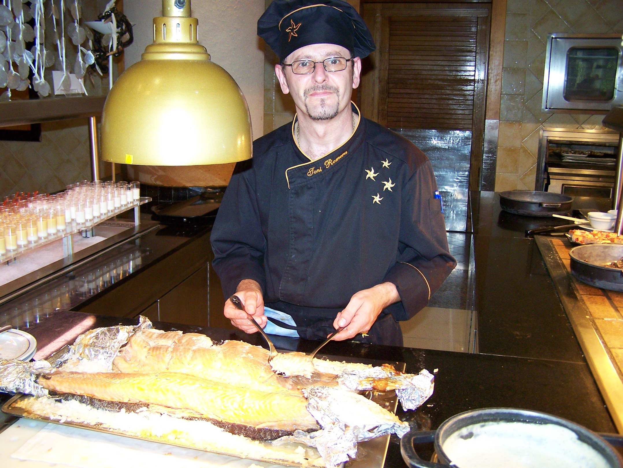 Freundlicher Koch reicht Lachs